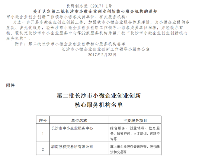 為進(jìn)一步開(kāi)展小微企業(yè)創(chuàng )業(yè)創(chuàng )新工作,加強我市小微企業(yè)服務(wù)體系建設,為小微企業(yè)提供多層次、多元化服務(wù),營(yíng)造良好的創(chuàng )新創(chuàng )業(yè)環(huán)境,長(cháng)沙市小微兩創(chuàng )辦先后確立了兩批核心服務(wù)機構。