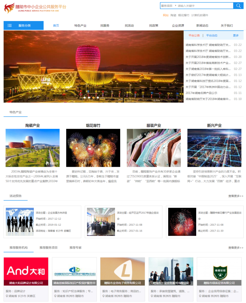門(mén)戶(hù)平臺主要展示醴陵市的陶瓷、煙花、服裝等特色產(chǎn)業(yè)及入駐企業(yè)、產(chǎn)業(yè)政策、新聞活動(dòng)等信息,有助于企業(yè)加深對醴陵市產(chǎn)業(yè)及相關(guān)政策的了解。
